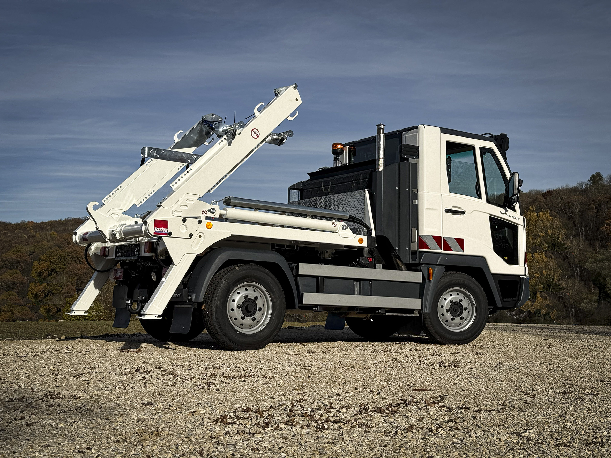 Sieht im Vergleich zu dem Aufbau auf dem Unimog relativ klein aus, leistet aber einen großen Dienst im kommunalen Alltag. Ein kompakter, wendiger Aufbau, der Containerwechsel, Grüngut- oder Baustellentransporte sicher und leichter macht.